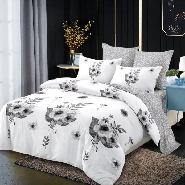 Lenjerie pat dublu, FINET, cu elastic, 6 piese, Gri, flori, Primavara Casa, cod produs: CFE229
