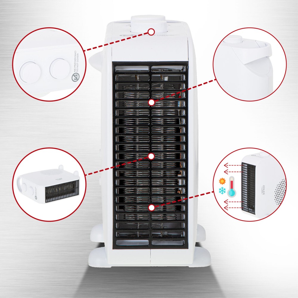 Un termoventilator fiabil cu două funcții. Poate funcționa la două niveluri de putere și are un termostat încorporat, permițându-vă să reglați cantitatea de căldură generată în funcție de nevoile dumneavoastră. De asemenea, poate funcționa ca dispozitiv de răcire, producând un suflu rece. Din acest motiv, aeroterma cu ventilator își are utilitatea atât în zilele reci, cât și în cele călduroase. Pentru un plus de siguranță, dispozitivul este dotat cu protecție împotriva supraîncălzirii. Un avantaj suplimentar este faptul că încălzitorul cu ventilator poate fi poziționat pe orizontală sau pe verticală.