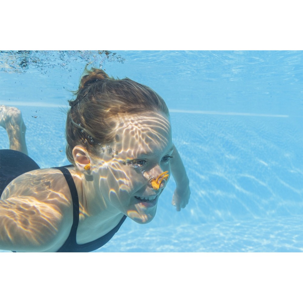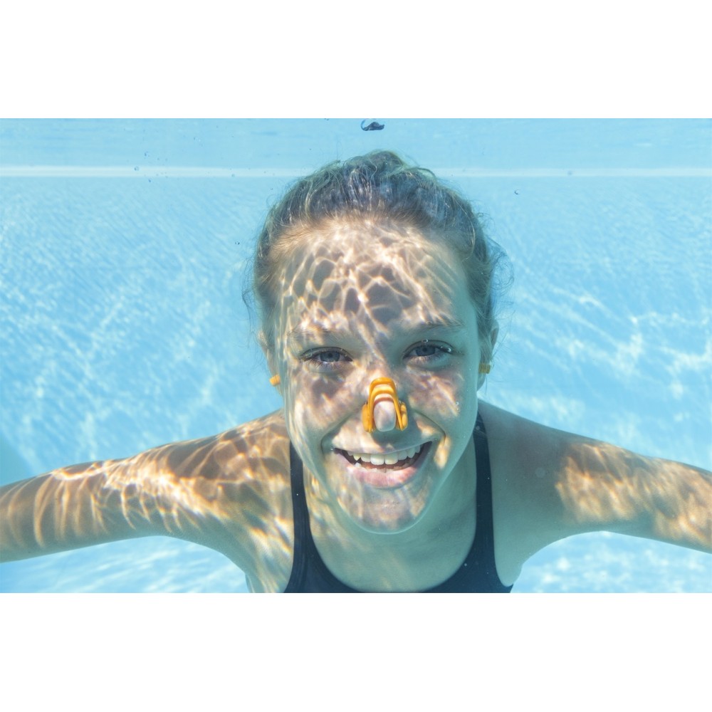 Clema pentru nas aderă stabil, datorită căreia nu alunecă în timpul înotului și blochează strâns apa să pătrundă în nări.
