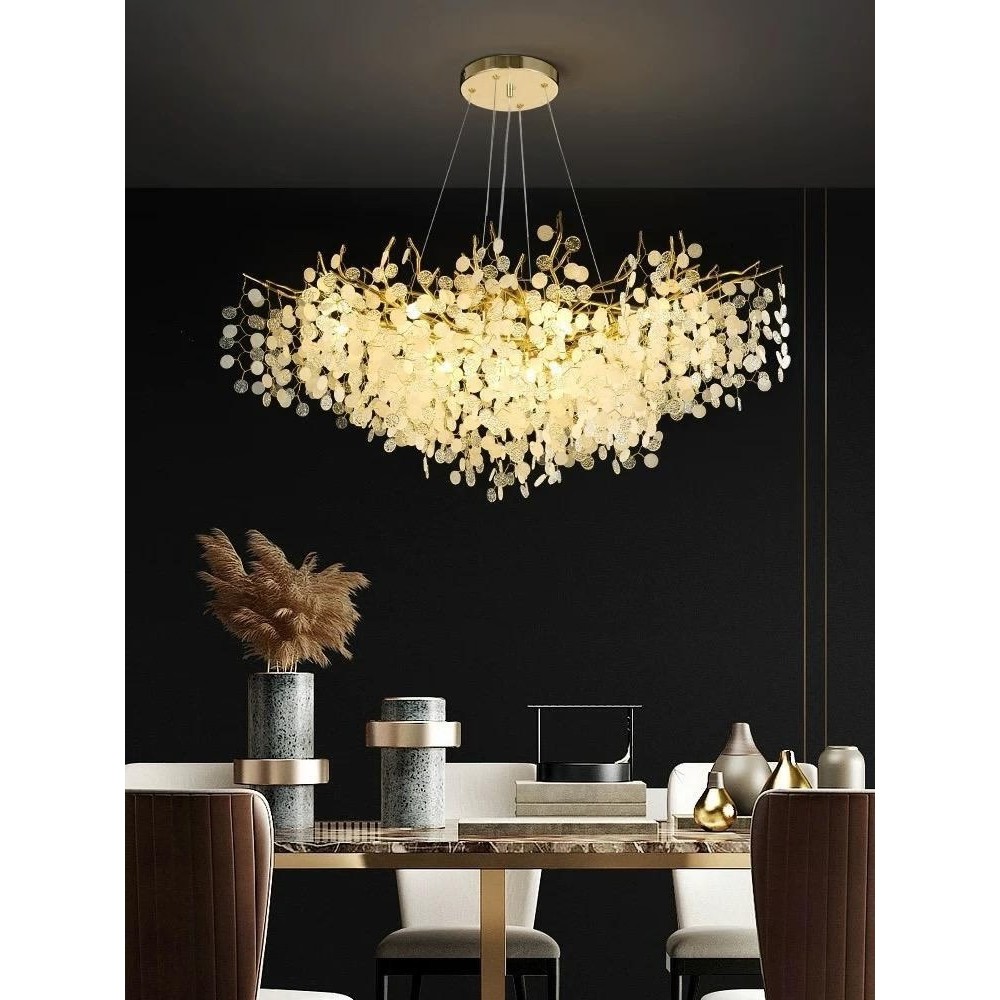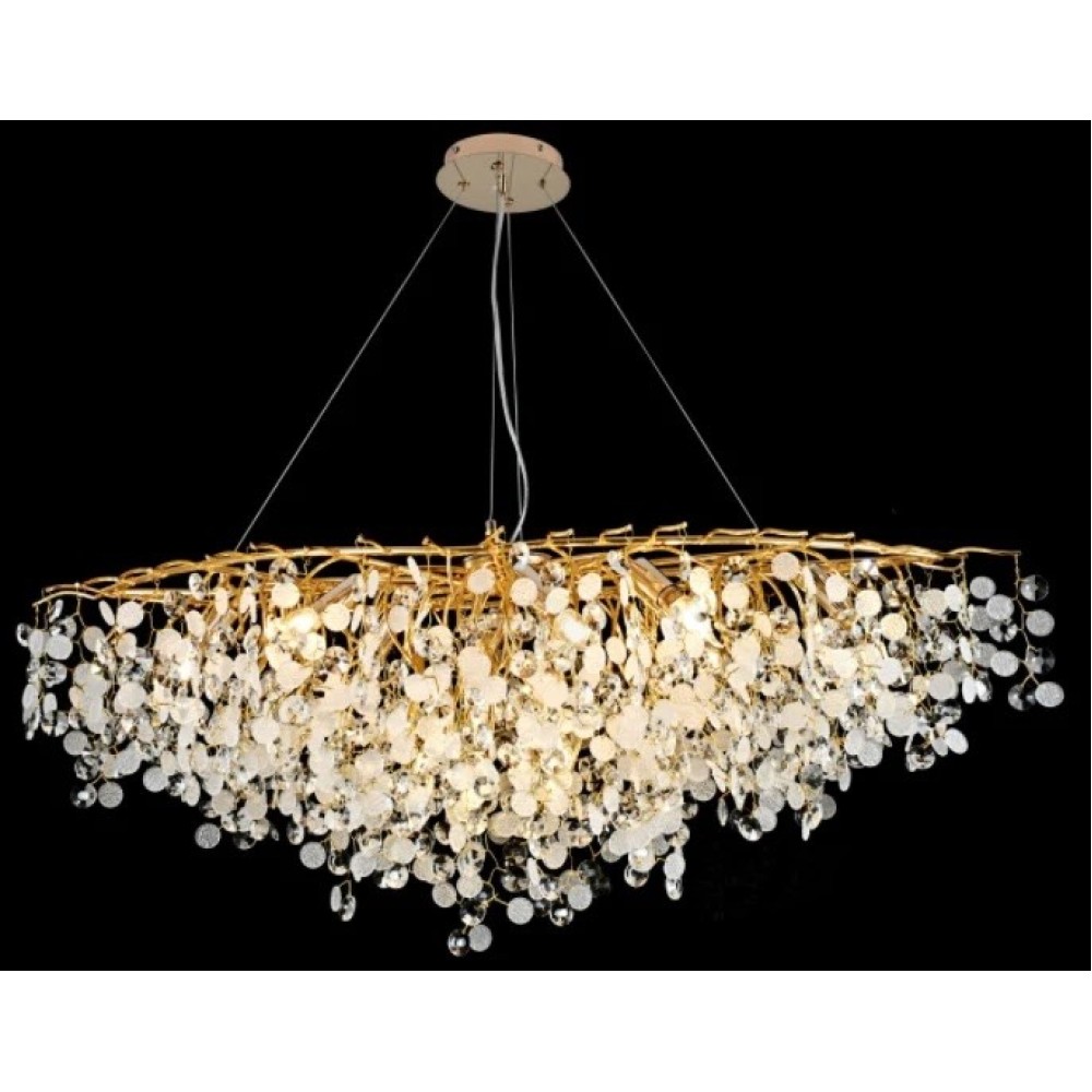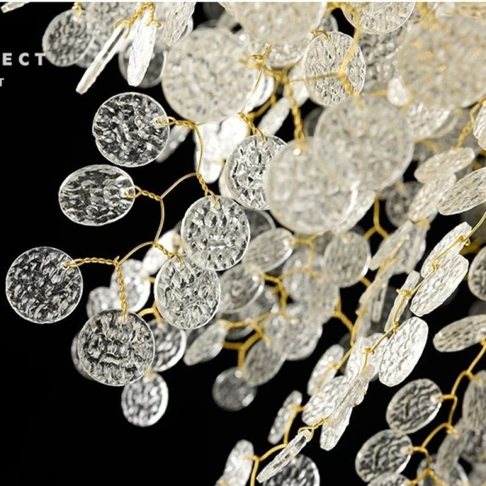 Candelabru impozant și luxos, cu un design care evocă o atmosferă de sărbătoare sau un peisaj înghețat. Candelabrul are o structură metalică auriu strălucitoare de la care atârnă numeroase elemente decorative din sticlă, dispuse într-un mod care imită forma unor crengi încărcate cu boboci de gheață sau picături de rouă.