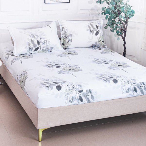 Cearșaf cu Elastic 180x200 cm + 2 Fețe de Pernă 50x70 cm, Alb, Frunze Gri cu Floricele, Casa Minunata, cod produs: INS-HS24