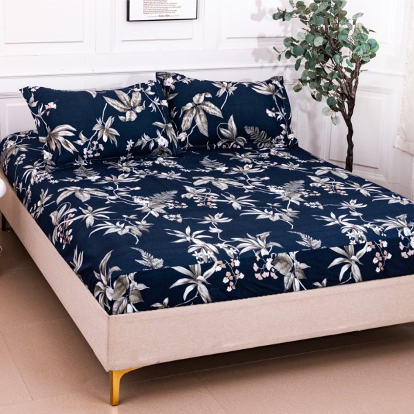 Cearșaf cu Elastic 180x200 cm + 2 Fețe de Pernă 50x70 cm, Bleumarin, Frunze Gri, Casa Minunata, cod produs: INS-HS13