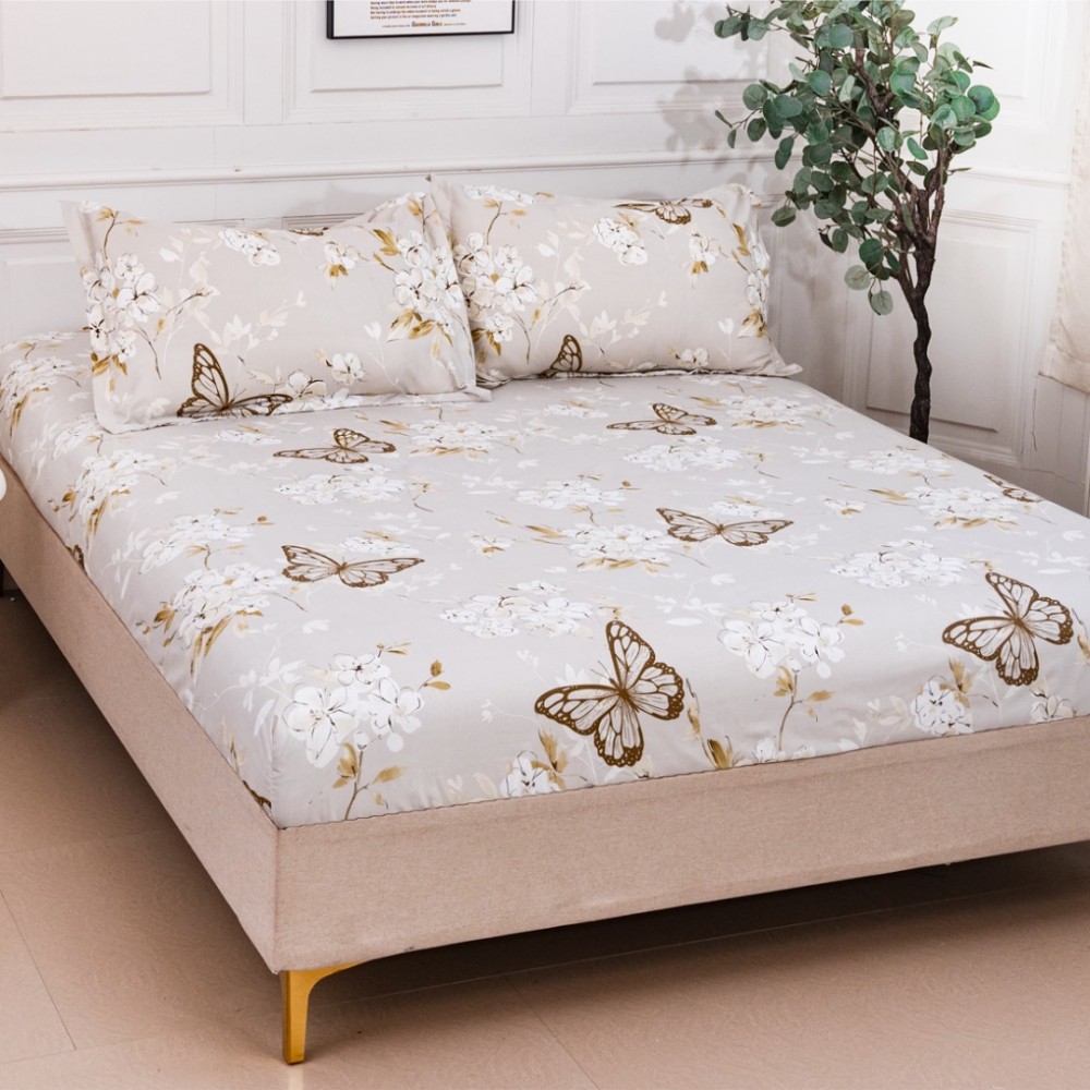 Cearșaf cu Elastic 180x200 cm + 2 Fețe de Pernă 50x70 cm, Grej, Crenguțe de Copaci cu Flori si Fluturi, Casa Minunata, cod produs: INS-HS30