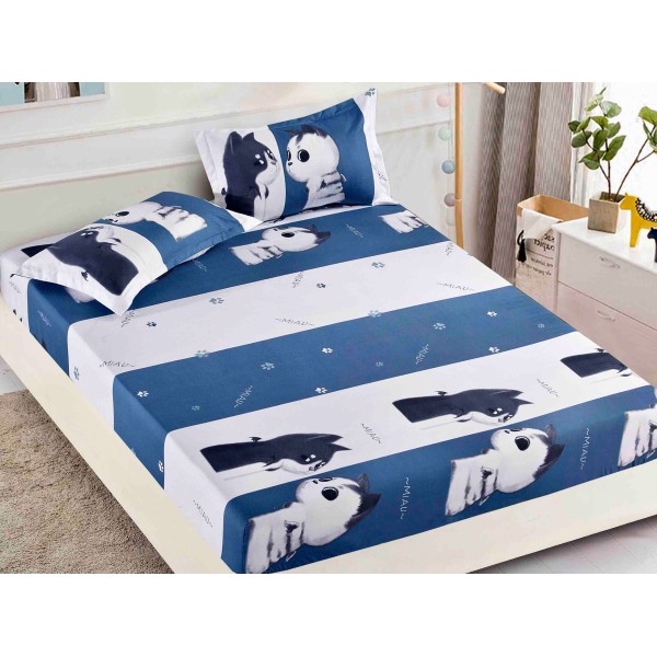 Cearsaf cu elastic, Bumbac FINET, 160/180x200cm, 2 fete de perne 50x70cm, Jojo Home, Alb-Bleumarin, pisicute, cod produs: JOH137