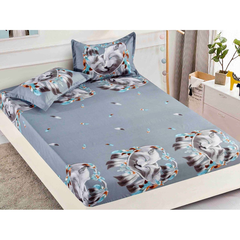 Cearsaf cu elastic, Bumbac FINET, 160/180x200cm, 2 fete de perne 50x70cm, Jojo Home, Gri-Multicolor, pene, lupi, cod produs: JOH140