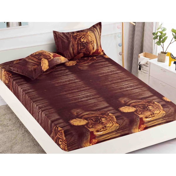 Cearsaf cu elastic, Bumbac FINET, 160/180x200cm, 2 fete de perne 50x70cm, Jojo Home, Maro, tigri, cod produs: JOH144