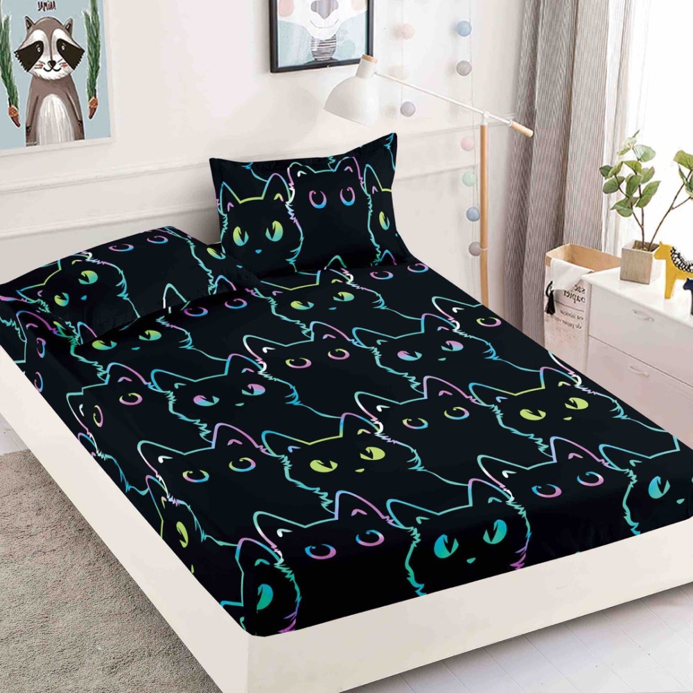 Cearsaf cu elastic, Bumbac FINET, 160/180x200cm, 2 fete de perne 50x70cm, Jojo Home, Negru, pisicute, cod produs: JOH291