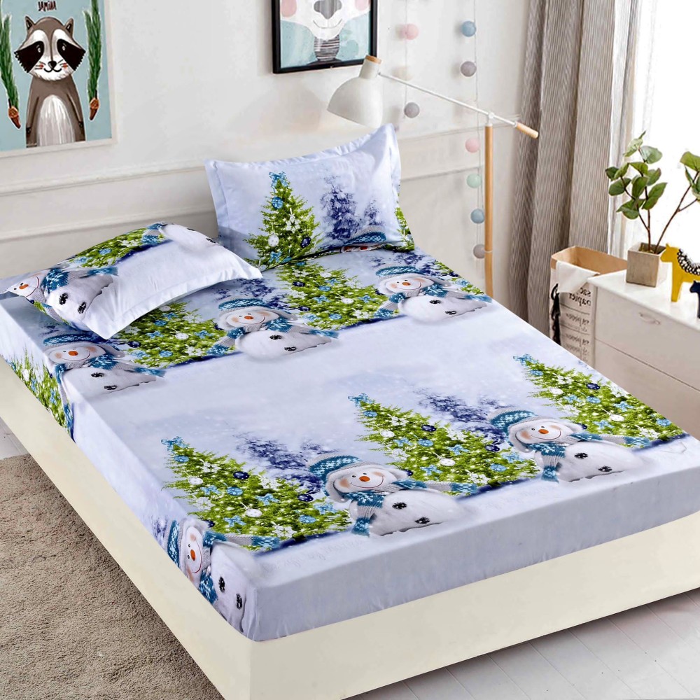 Cearsaf cu elastic, Bumbac FINET, 160/180x200cm, 2 fete de perne 50x70cm, Jojo Home, Craciun, Bleu, oameni de zapada, brazi, cod produs: JOM313