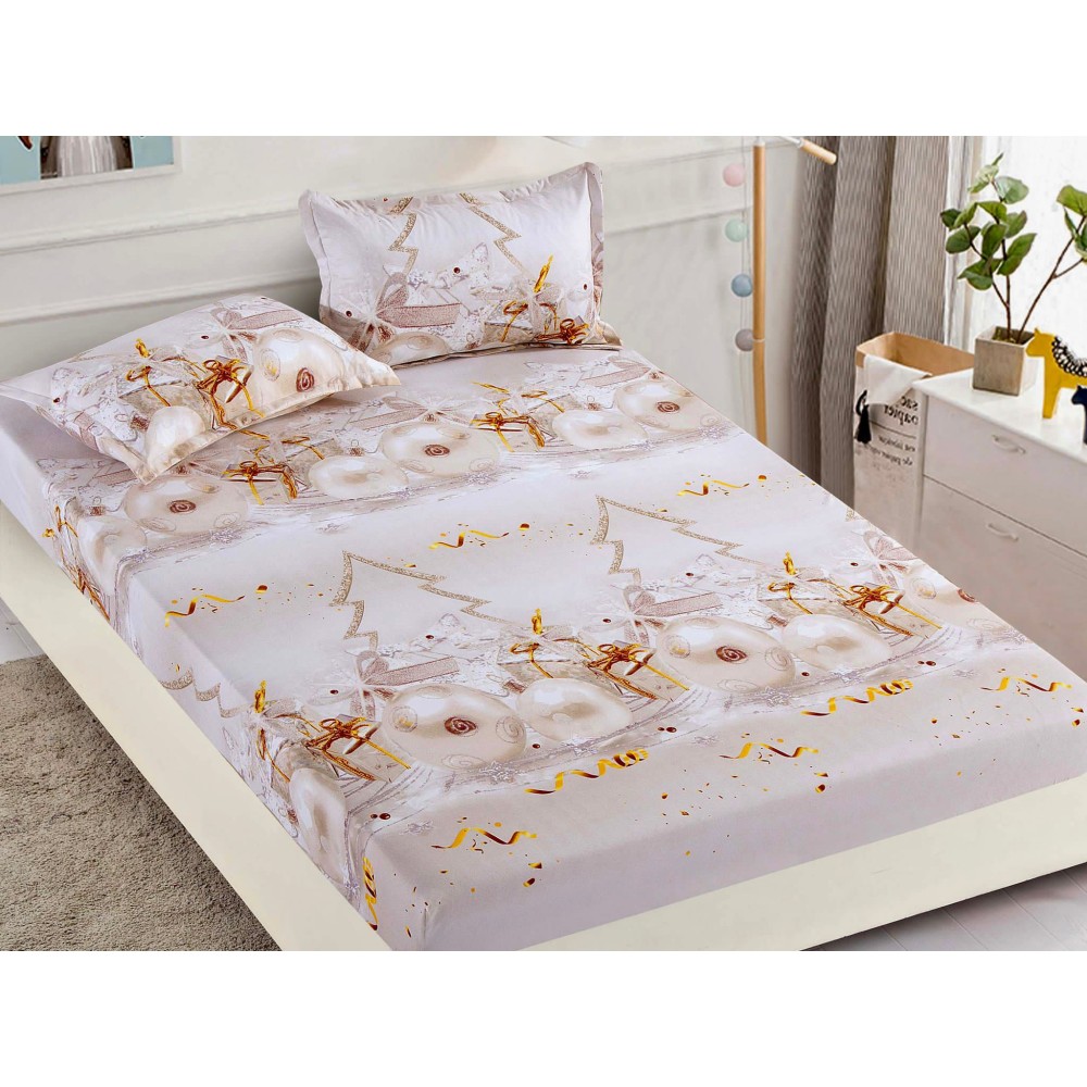 Cearsaf cu elastic, Bumbac FINET, 160/180x200cm, 2 fete de perne 50x70cm, Craciun, Jojo Home, Bej, globulete, cod produs: JOH623