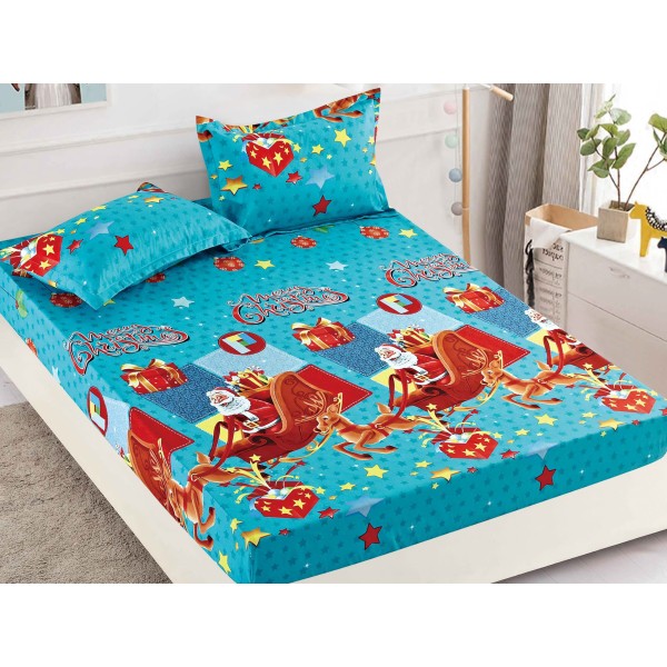Cearsaf cu elastic, Bumbac FINET, 160/180x200cm, 2 fete de perne 50x70cm, Craciun, Jojo Home, Bleu, Mos Craciun, cod produs: JOH608