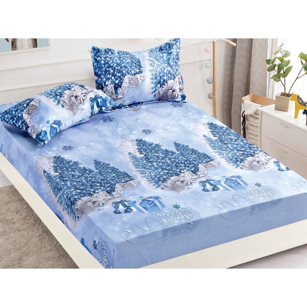 Cearsaf cu elastic, Bumbac FINET, 160/180x200cm, 2 fete de perne 50x70cm, Craciun, Jojo Home, Bleu, oameni de zapada, brazi, cod produs: JOH621