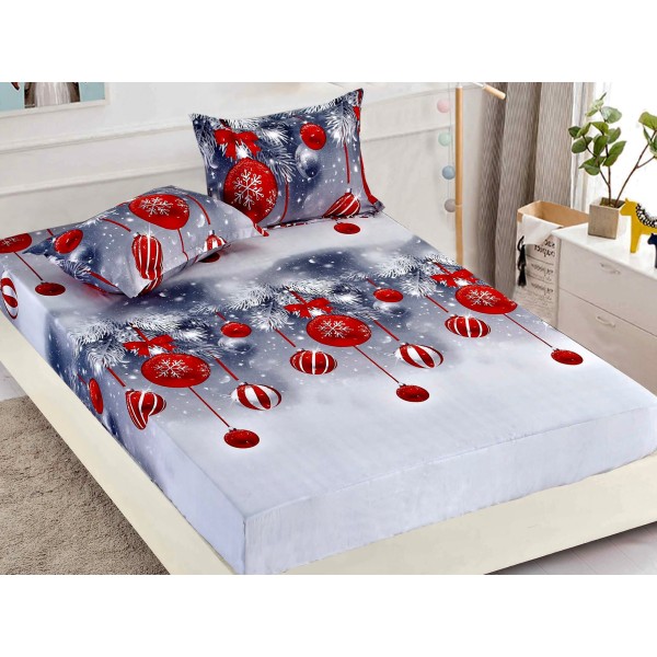 Cearsaf cu elastic, Bumbac FINET, 160/180x200cm, 2 fete de perne 50x70cm, Craciun, Jojo Home, Gri-Rosu, globulete, cod produs: JOH619
