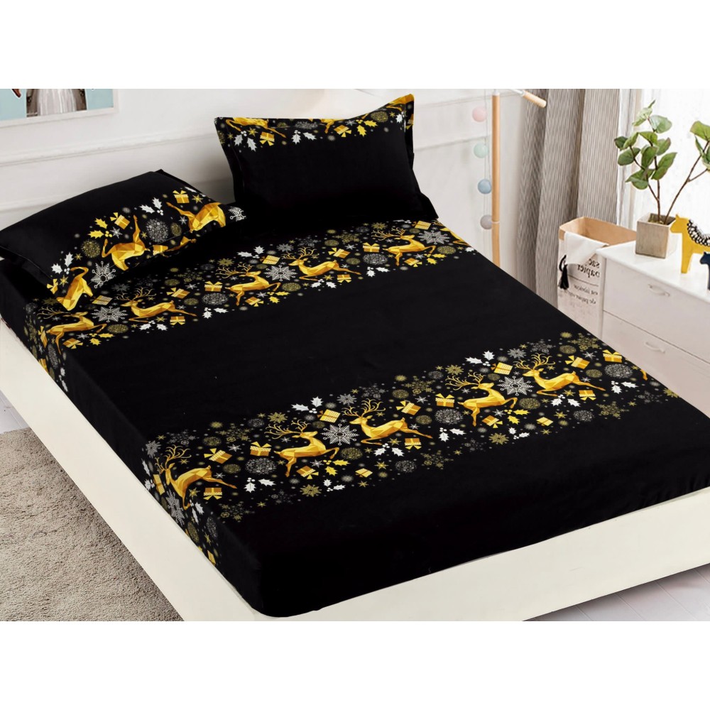 Cearsaf cu elastic, Bumbac FINET, 160/180x200cm, 2 fete de perne 50x70cm, Craciun, Jojo Home, Negru-Auriu, reni, cod produs: JOH627