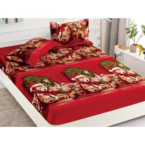 Cearsaf cu elastic, Bumbac FINET, 160/180x200cm, 2 fete de perne 50x70cm, Craciun, Jojo Home, Rosu, ursuleti, cod produs: JOH620