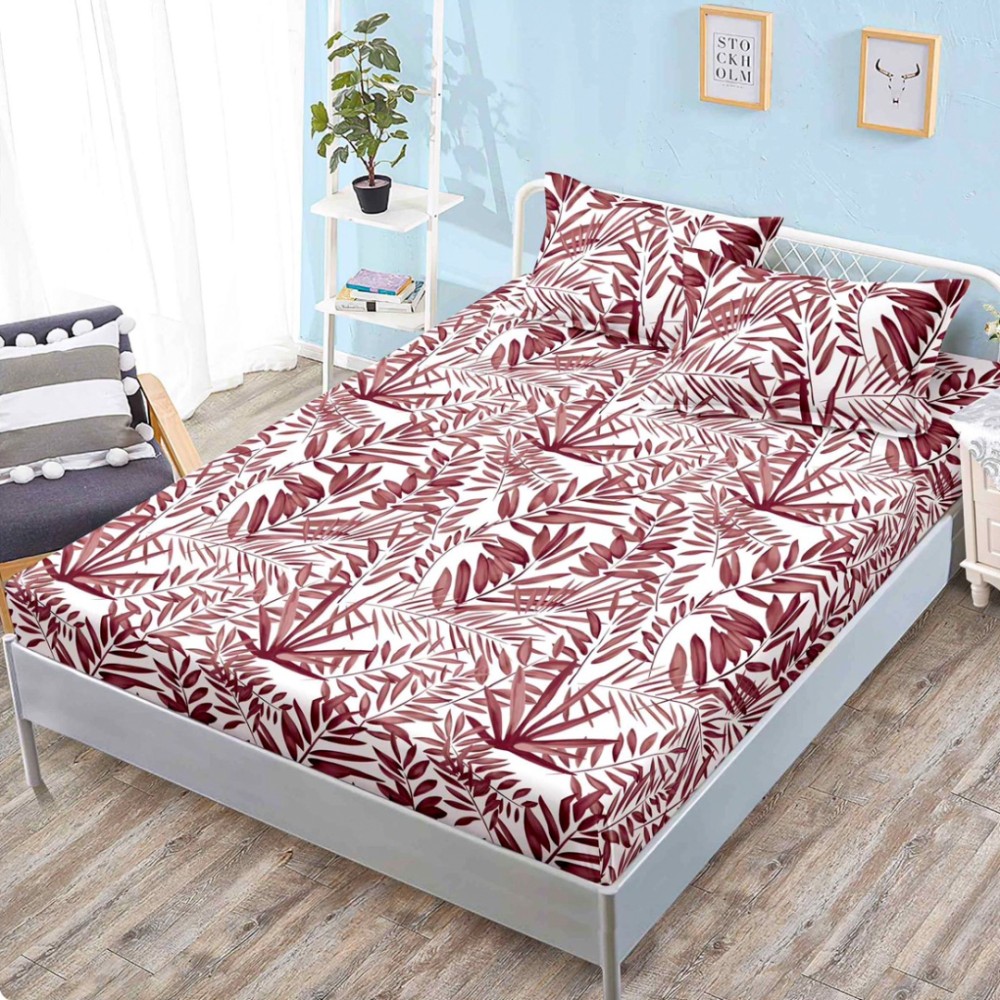 Cearsaf cu elastic, FINET, 160x200cm, 2 fete de perne 50x70cm, Alb, Grena, Frunze – confort și eleganță pentru patul tău, Primavara Casa, cod produs: PRM-HF-D3001