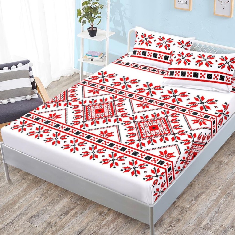 Cearsaf cu elastic, FINET, 180x200cm, 2 fete de perne 50x70cm, Alb-Rosu, model traditional, Johny Home Pucioasa, cod produs: SPR-G-229
