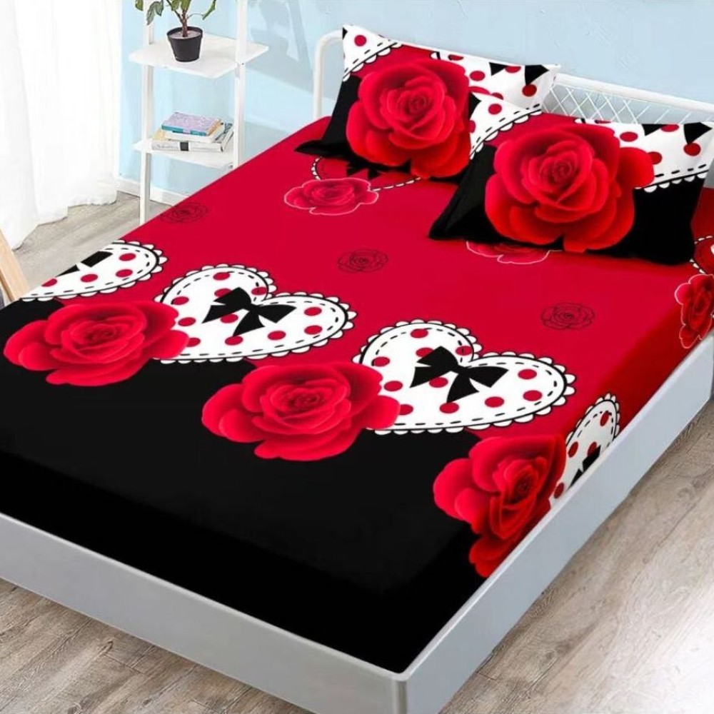 Cearsaf cu elastic, FINET, 180x200cm, 2 fete de perne 50x70cm, Rosu-Negru, trandafiri, buline, fundite, Home Style Pucioasa, cod produs: MMH5
