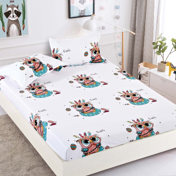 Cearsaf cu elastic, Bumbac FINET, 90x200cm, 2 fete de perne 50x70cm, Jojo Home, Alb-Multicolor, bufnite, cod produs: JOH416