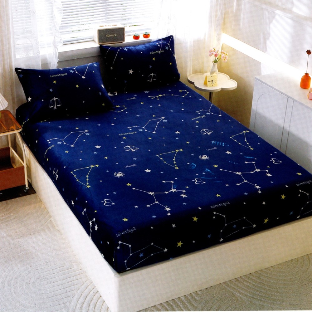 Cearșaf cu Elastic Cocolino 180x200x25 cm – Set cu 2 Fețe de Pernă, Gros și Pufos, Calitate Premium pentru Confort și Eleganță, Albastru, Constelatii, Super Design Pucioasa, cod produs: BCC-HCE02