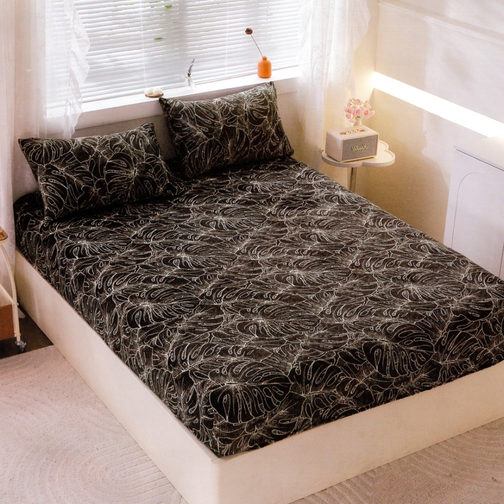 Cearșaf cu Elastic Cocolino 180x200x25 cm – Set cu 2 Fețe de Pernă, Gros și Pufos, Calitate Premium pentru Confort și Eleganță, Negru, Alb, Frunze, Super Design Pucioasa, cod produs: BCC-HCE13
