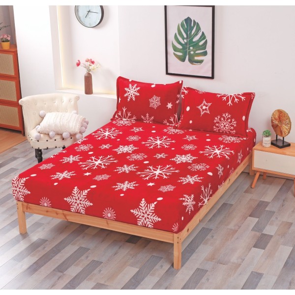 Cearsaf cu elastic CoCoLiNo Polar, 180x200x25cm, 2 fete de perne 50x70cm, Rosu, Alb, fulgi de nea, CumparaMisim, cod produs: SKH308