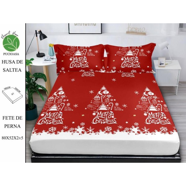 Cearsaf cu elastic tip husa din FINET pentru saltea 180x200+25cm si doua fete de perna 52x80cm, Elegant Home Pucioasa, Mos Craciun, Alb-Rosu, cod produs: HFQ7