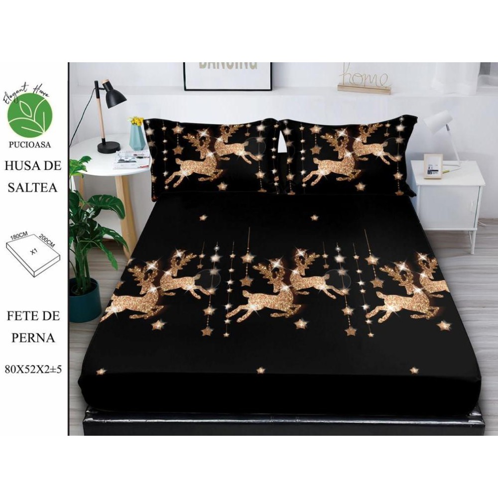 Cearsaf cu elastic tip husa din FINET pentru saltea 180x200+25cm si doua fete de perna 52x80cm, Elegant Home Pucioasa, Mos Craciun, Negru-Auriu, cod produs: HFQ12