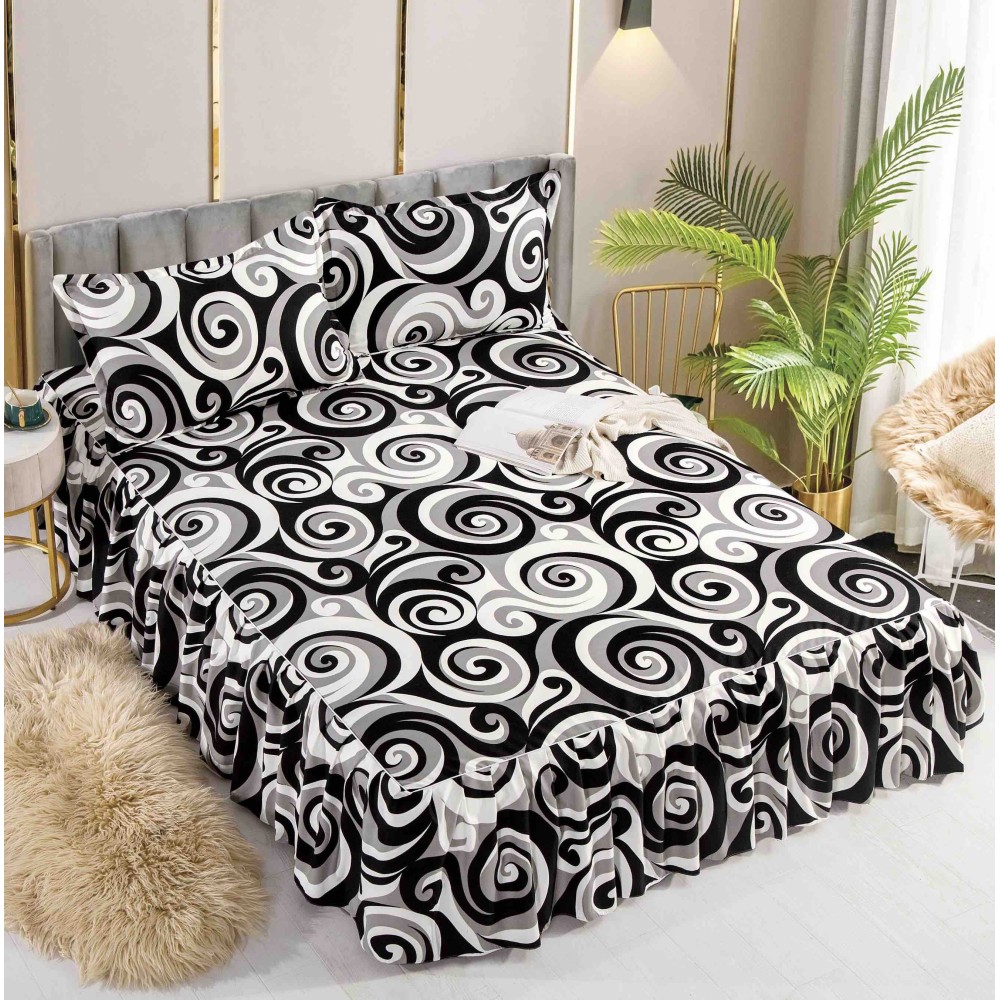 Cearsaf cu volanase, Bumbac FINET, 180x200cm, 2 fete de perne 50x70cm, Jojo Home, Alb-Negru, model abstract, cod produs: JOC109