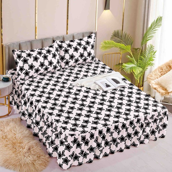 Cearsaf cu volanase, Bumbac FINET, 180x200cm, 2 fete de perne 50x70cm, Jojo Home, Alb-Negru, stelute, cod produs: JOC106