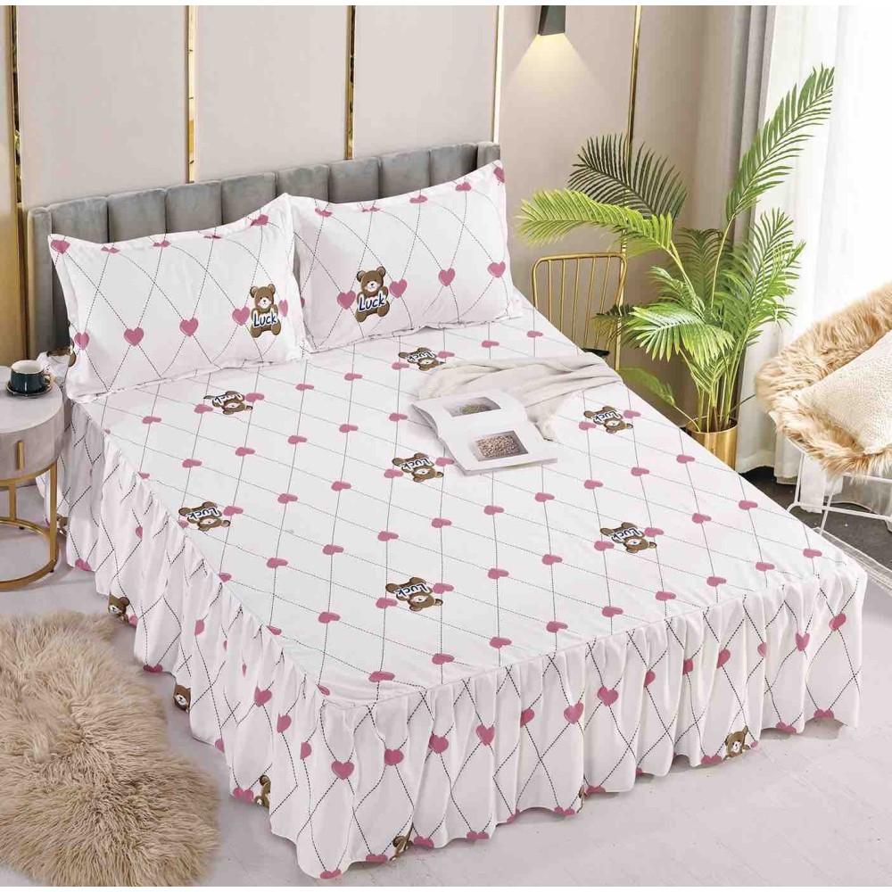 Cearsaf cu volanase, Bumbac FINET, 180x200cm, 2 fete de perne 50x70cm, Jojo Home, Alb-Roz, inimioare, ursuleti, cod produs: JOC103