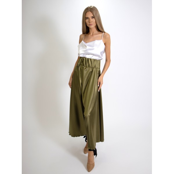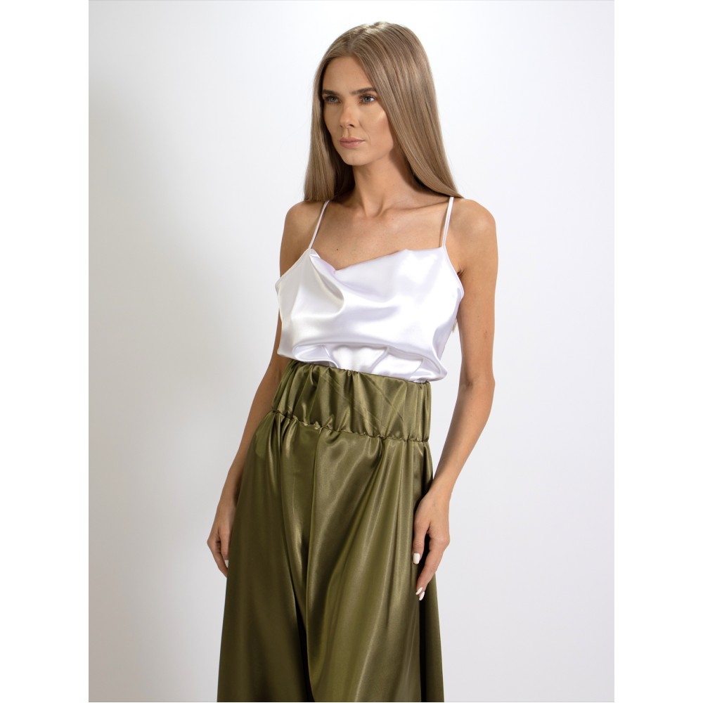 Set din doua piese din Satin, confectionat din maieu cu gusa si fusta pantalon. Pantalonul este croit lejer, cu croi larg si are talie inalta.