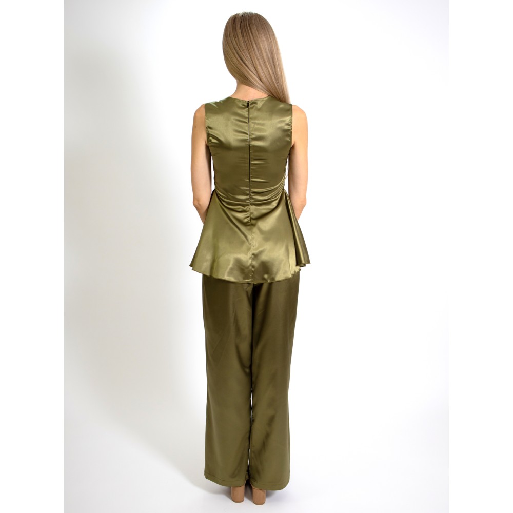 Set din doua piese din Satin, confectionat din maieu baby doll si fusta pantalon. Maieul se inchide la spate cu fermoar. Pantalonul este croit lejer, cu droi drept, si are talie inalta.