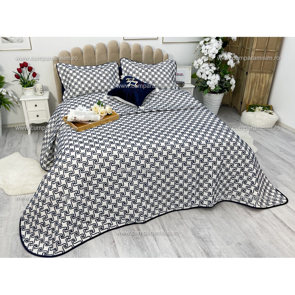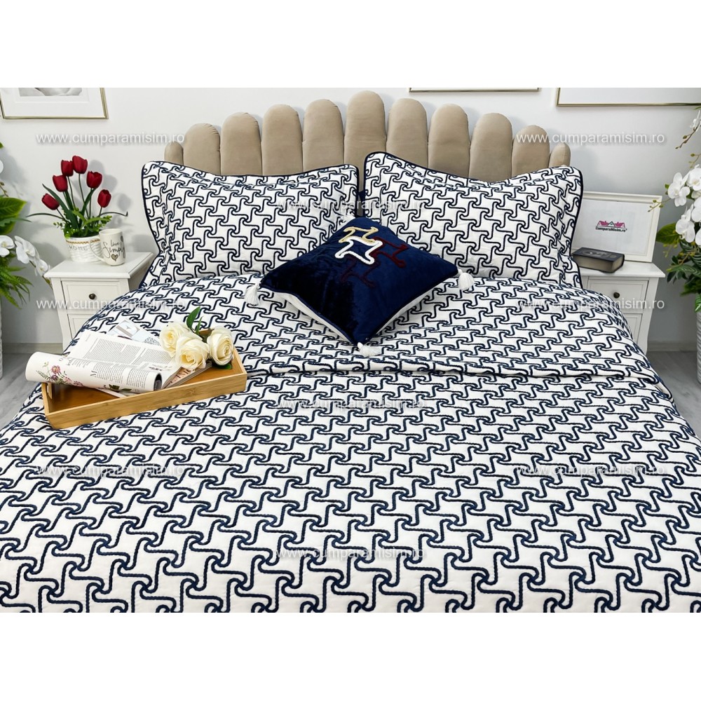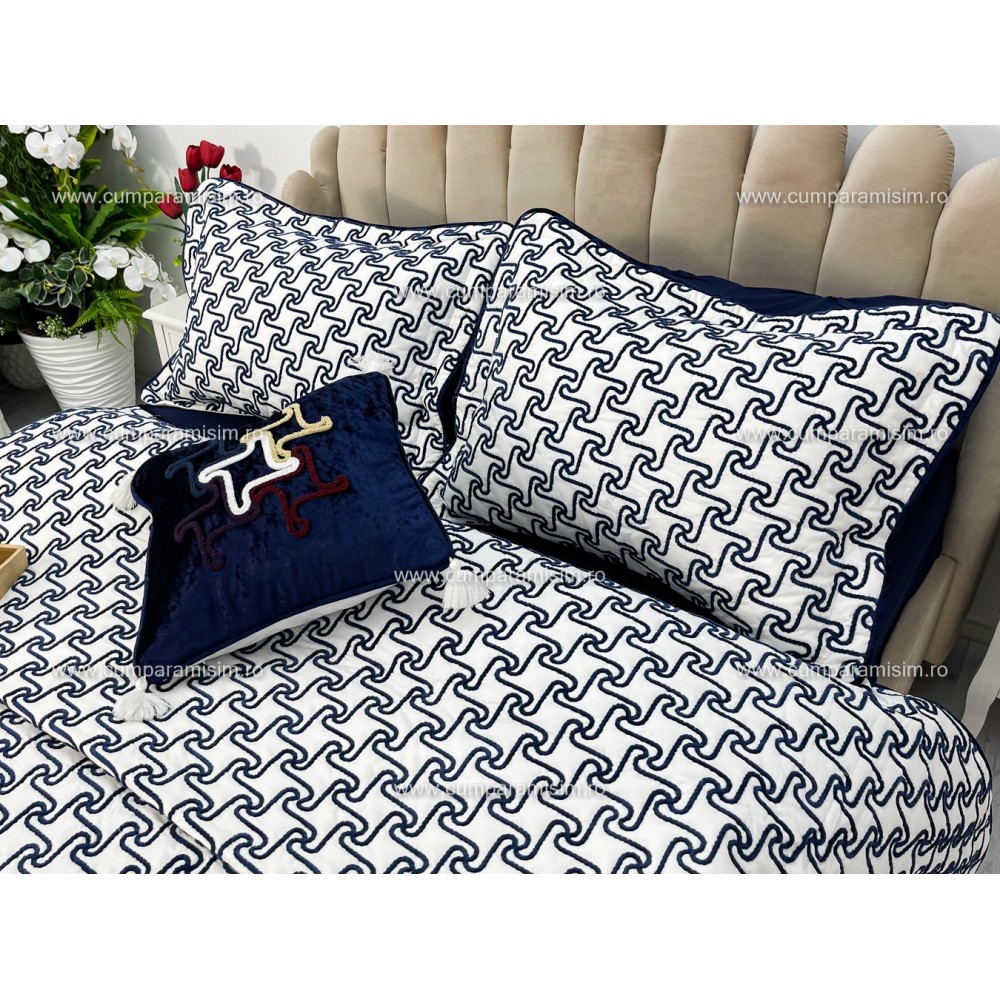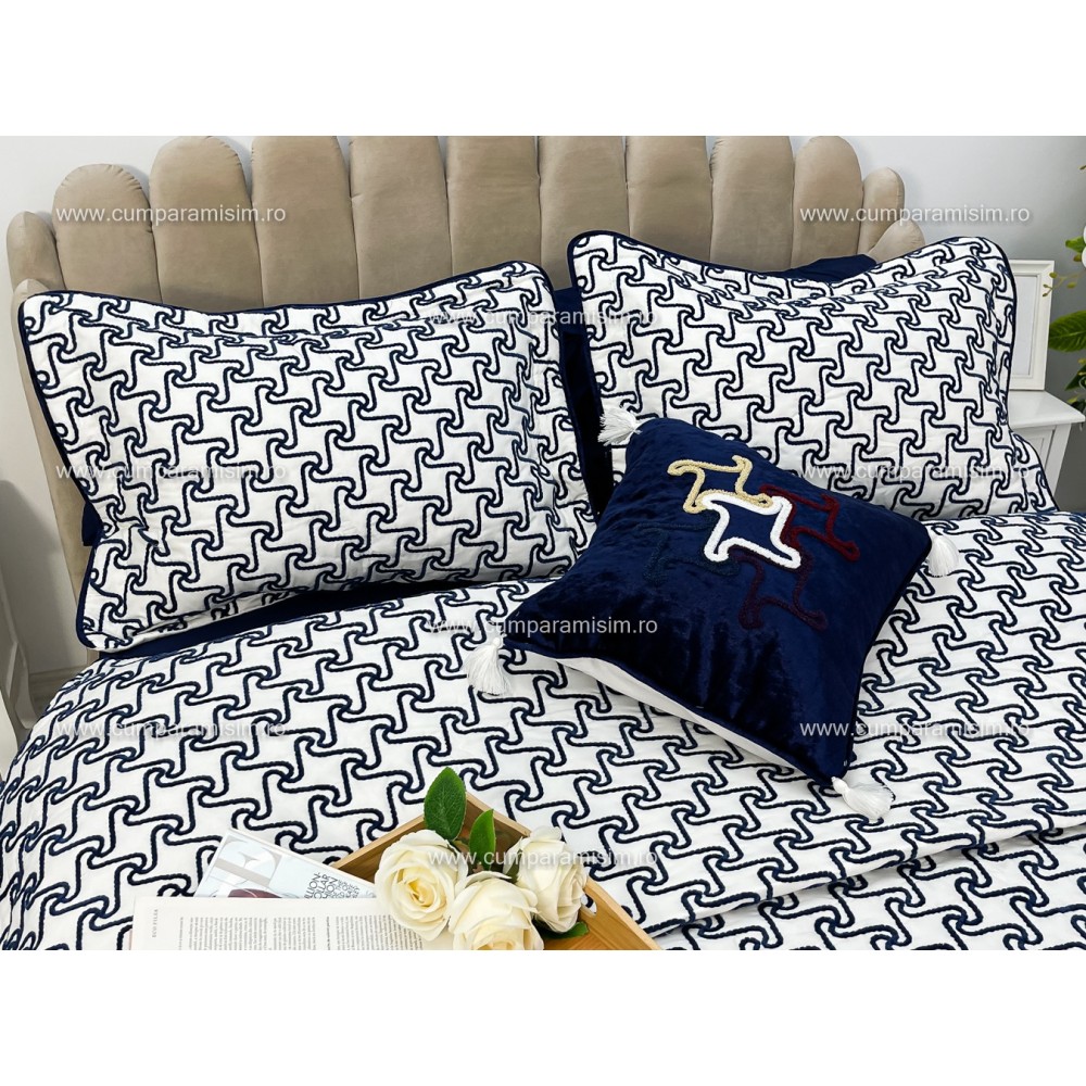 Cuvertura ARIA pentru pat dublu cu smocuri brodate si 3 fete de perna, Alb-Albastru, Casa Sabry, cod produs: CVS68