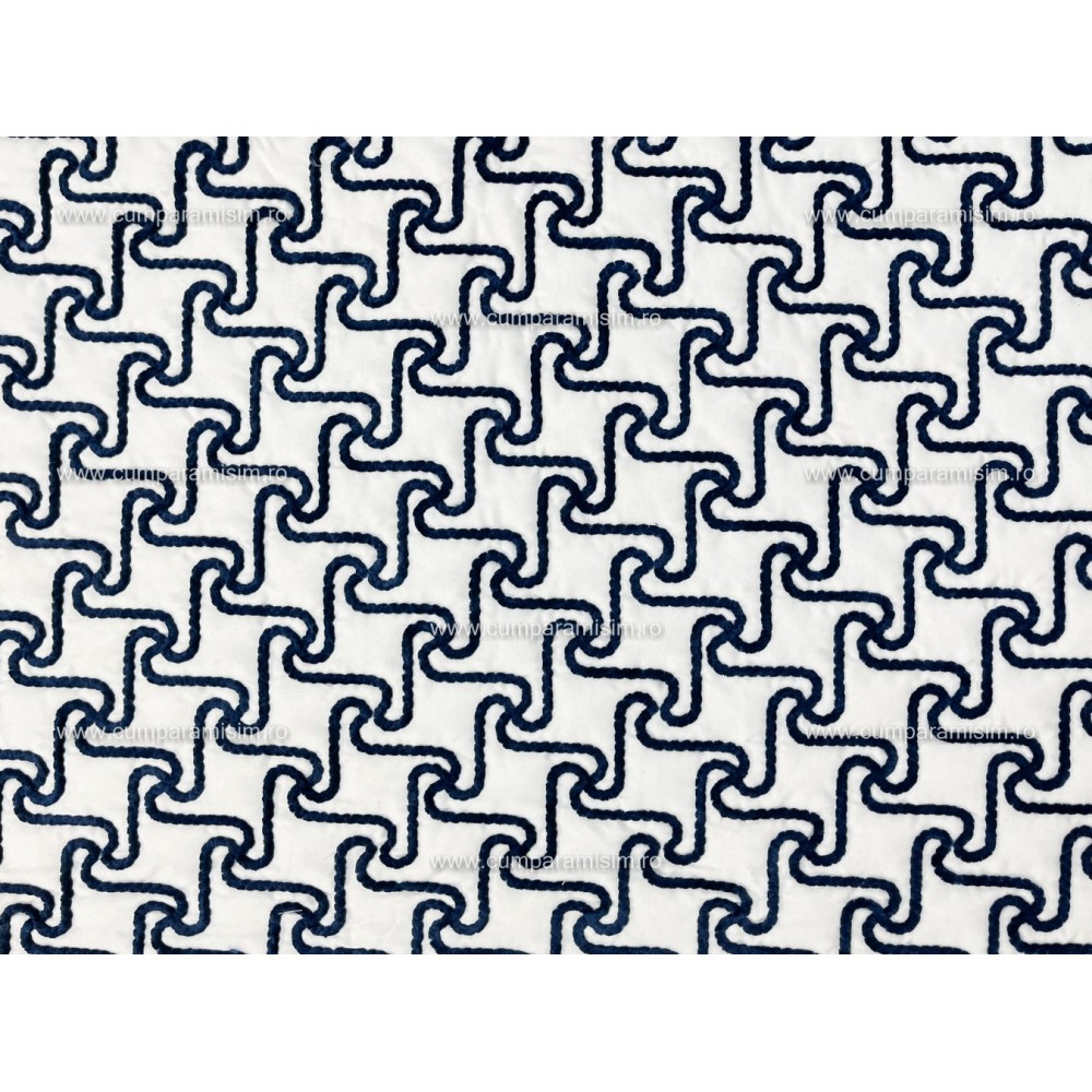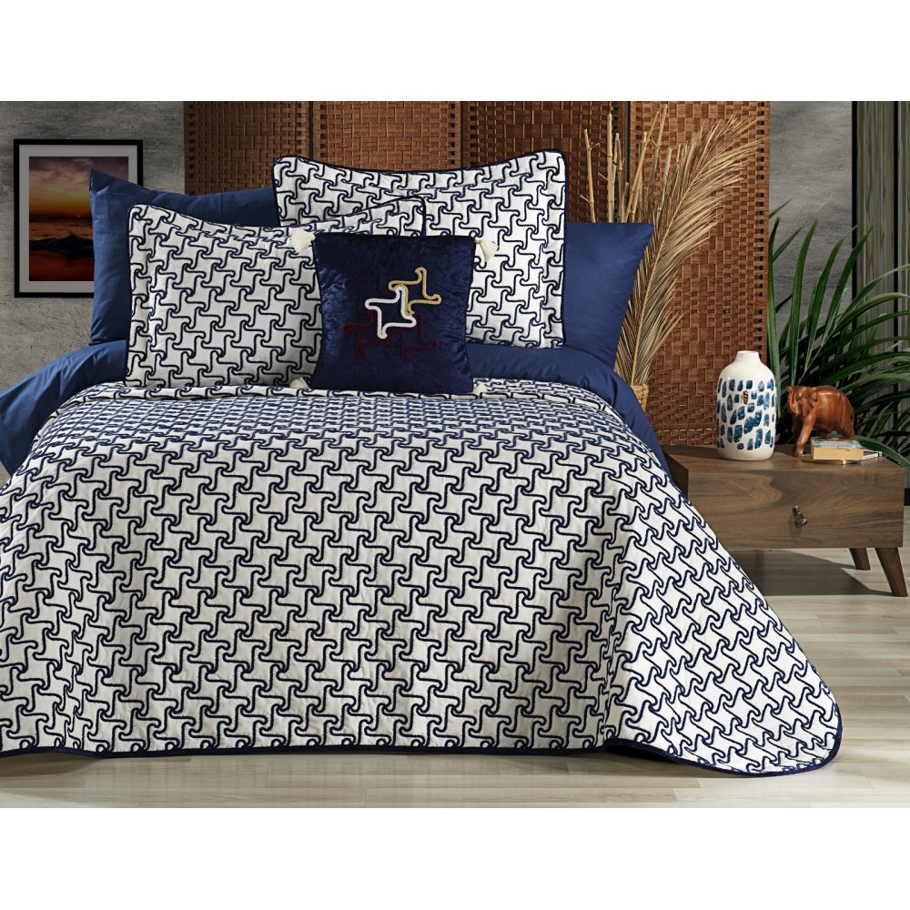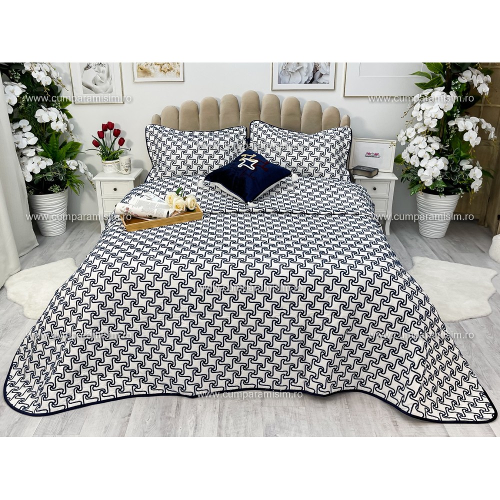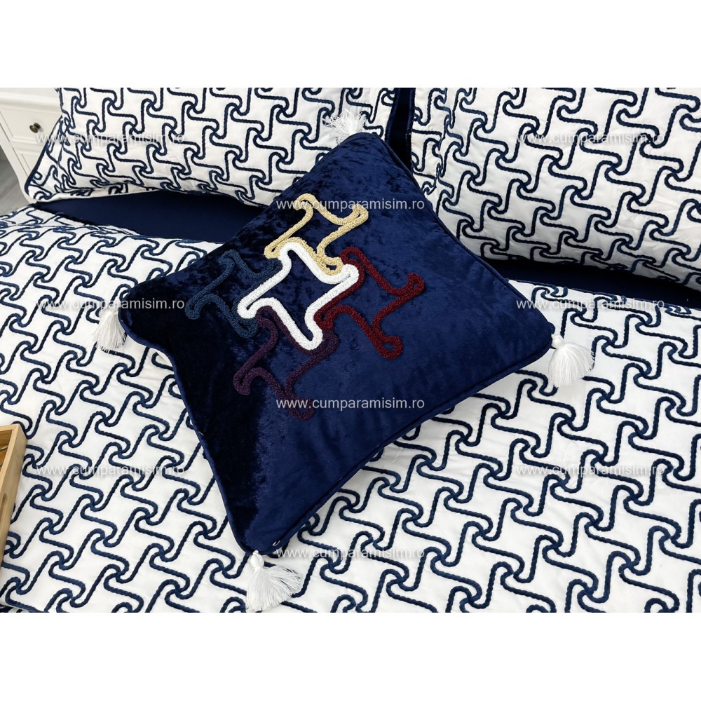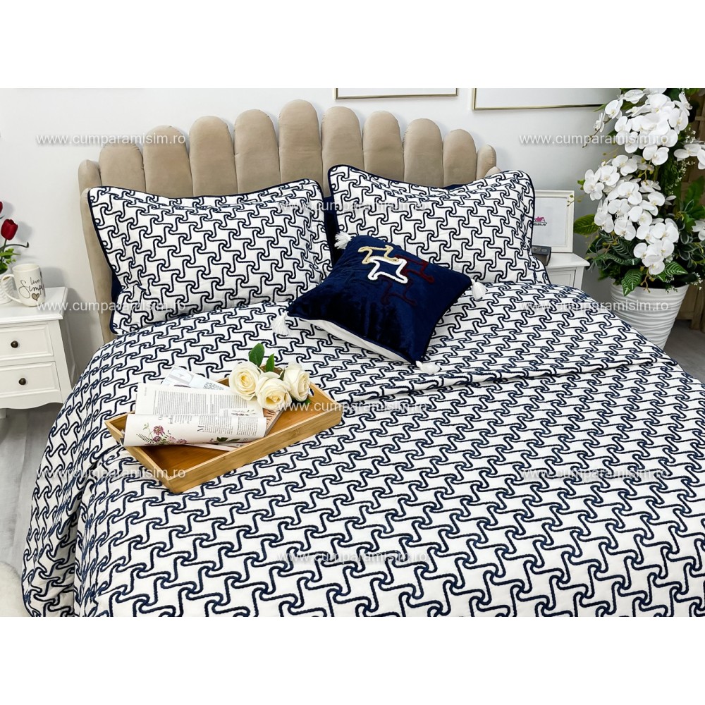 Cuvertura ARIA pentru pat dublu cu smocuri brodate si 3 fete de perna, Alb-Albastru, Casa Sabry, cod produs: CVS68