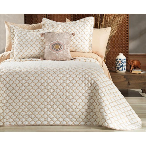 Cuvertura MELODIE pentru pat dublu cu smocuri brodate si 3 fete de perna, Alb-Auriu, Casa Sabry, cod produs: CVS40