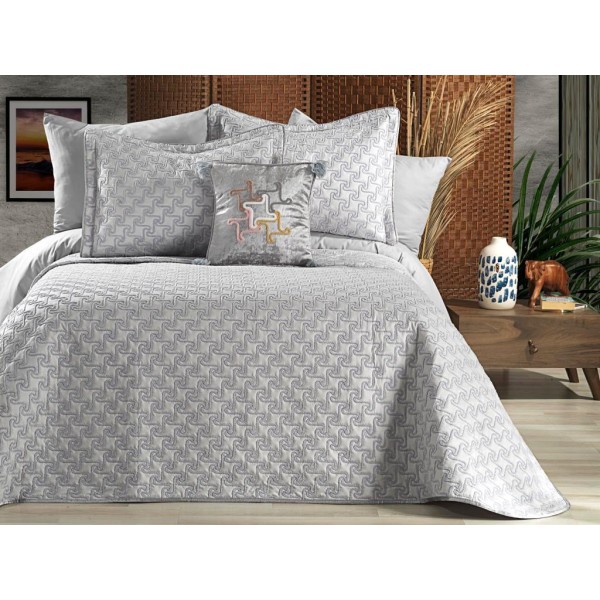 Cuvertura ARIA pentru pat dublu cu smocuri brodate si 3 fete de perna, Gri, Casa Sabry, cod produs: CVS67