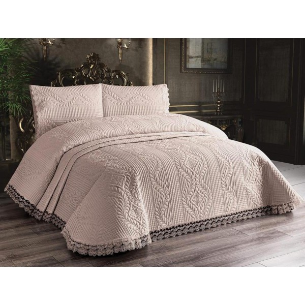 Cuvertura Brodata cu dantela pentru pat dublu si 2 fete de perna, SWEET Bej, Casa Sabry, cod produs: CVS32
