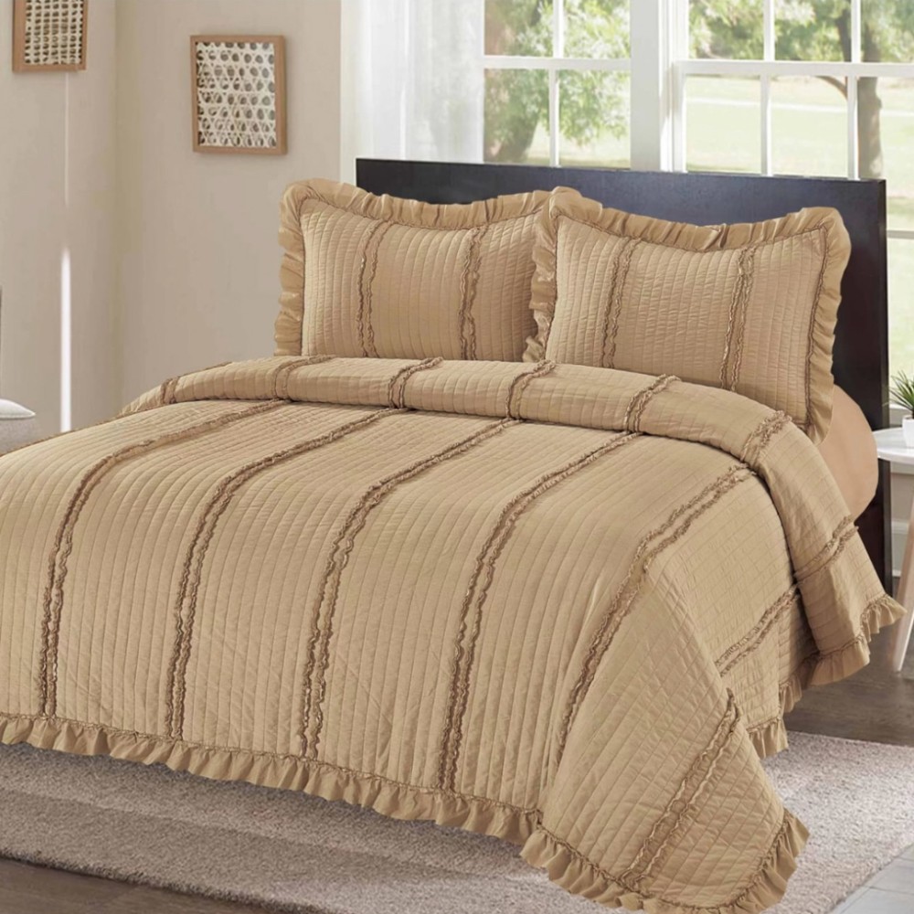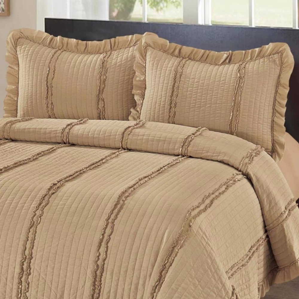 Cuvertură de Pat cu Volănașe, Matlasată, 230x250 cm, 3 Piese, Bumbac Satinat Superior, 2 Fețe de Pernă 50x70 cm, Maro, Casa Minunata, cod produs: INS-CVU11