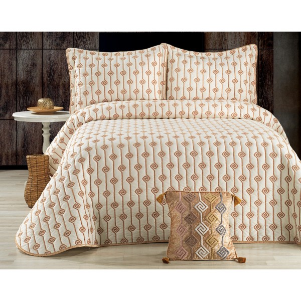 Cuvertura LORI pentru pat dublu cu smocuri brodate si 3 fete de perna, Alb-Auriu, Casa Sabry, cod produs: CVS54