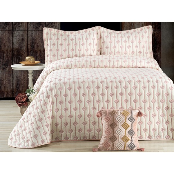Cuvertura LORI pentru pat dublu cu smocuri brodate si 3 fete de perna, Alb-Roz, Casa Sabry, cod produs: CVS51
