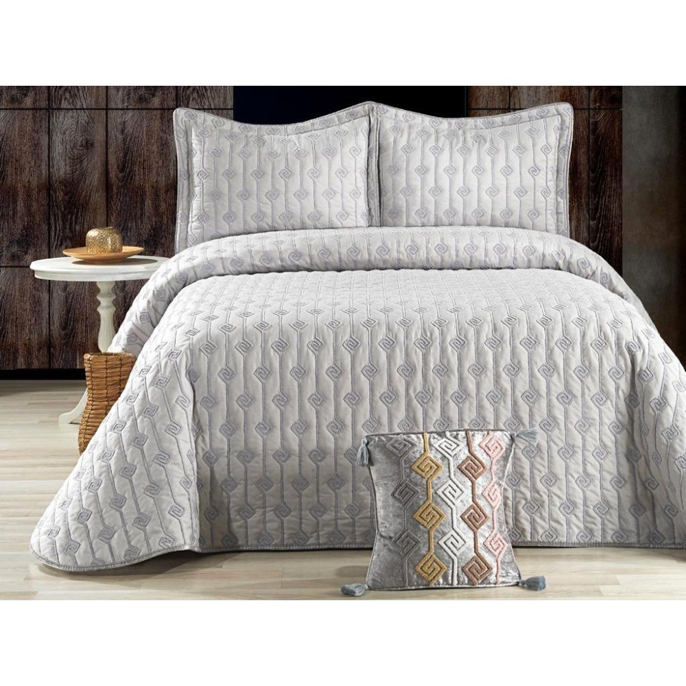 Cuvertura LORI pentru pat dublu cu smocuri brodate si 3 fete de perna, Gri, Casa Sabry, cod produs: CVS52