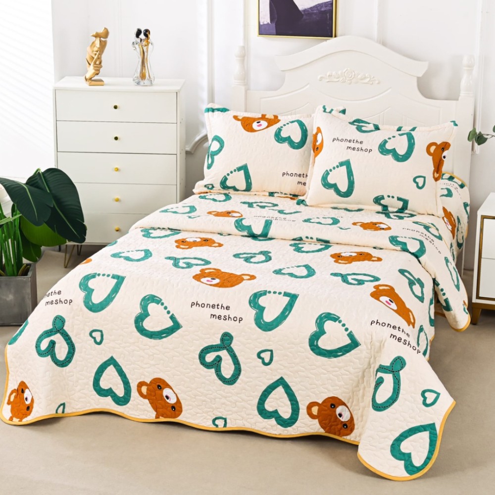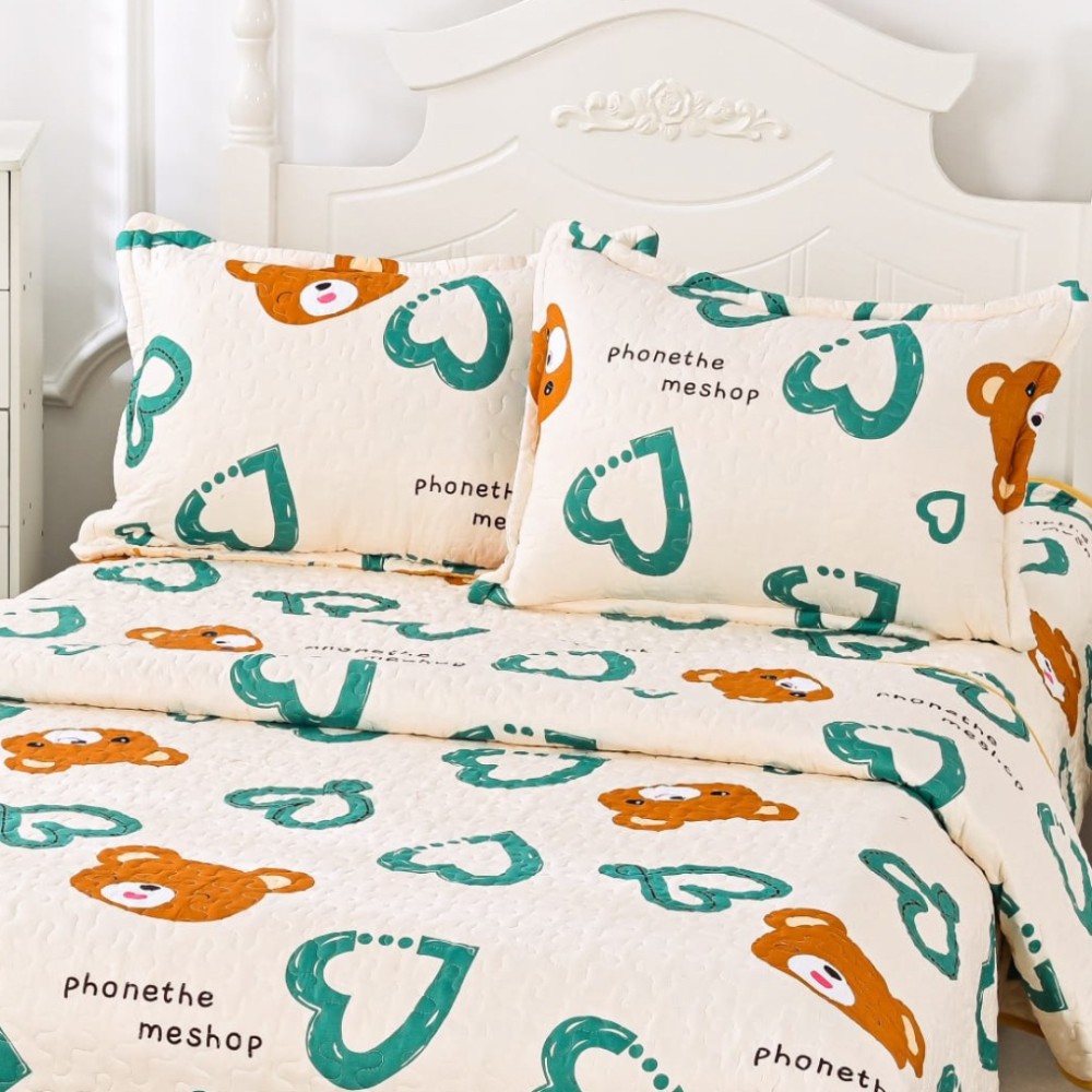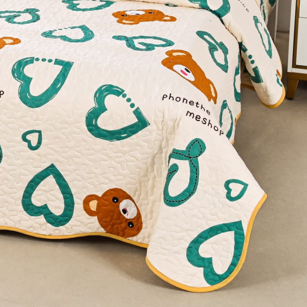 Cuvertură Matlasată din Bumbac Satinat, cu Bordură în Valuri (180x220 cm) + 2 Fețe de Pernă (60x80 cm), Crem cu Verde si Maro, Inimioare, Ursuleti, Casa Minunata, cod produs: INS-CVP03