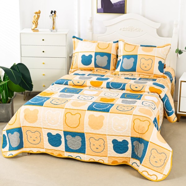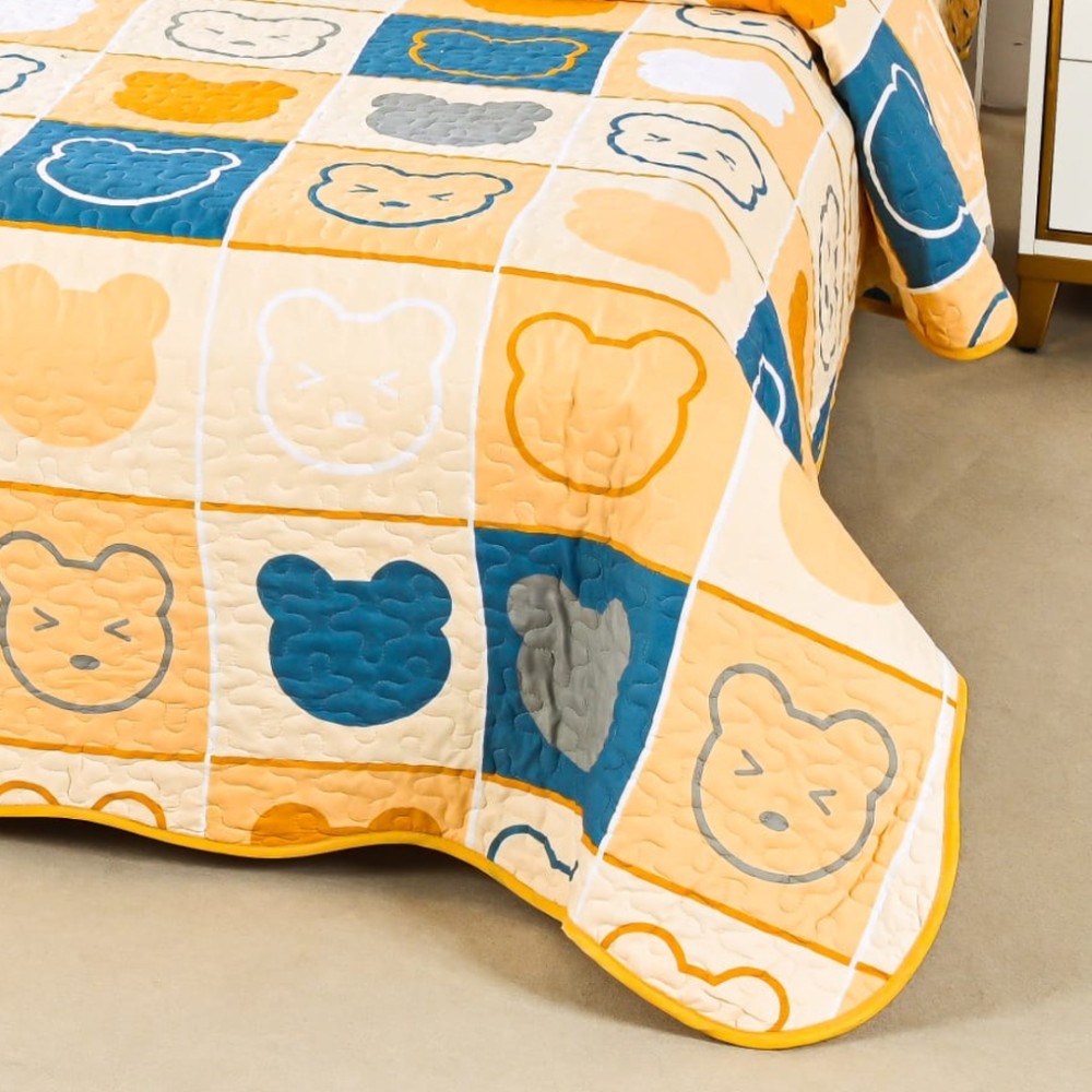 Cuvertură Matlasată din Bumbac Satinat, cu Bordură în Valuri (180x220 cm) + 2 Fețe de Pernă (60x80 cm), Galben cu Albastru, Ursuleti, Pătrate, Casa Minunata, cod produs: INS-CVP06