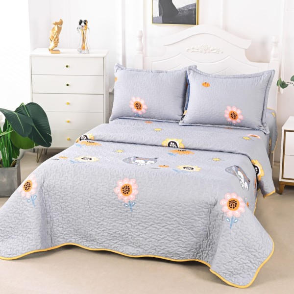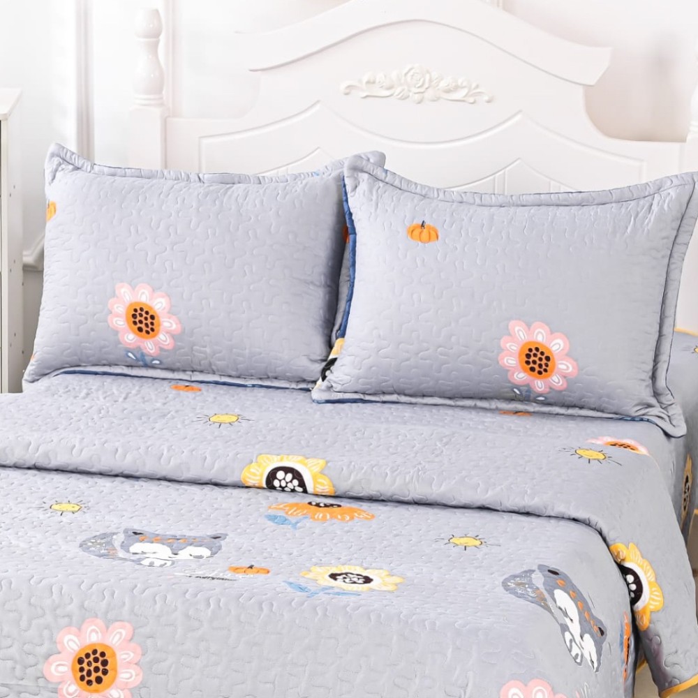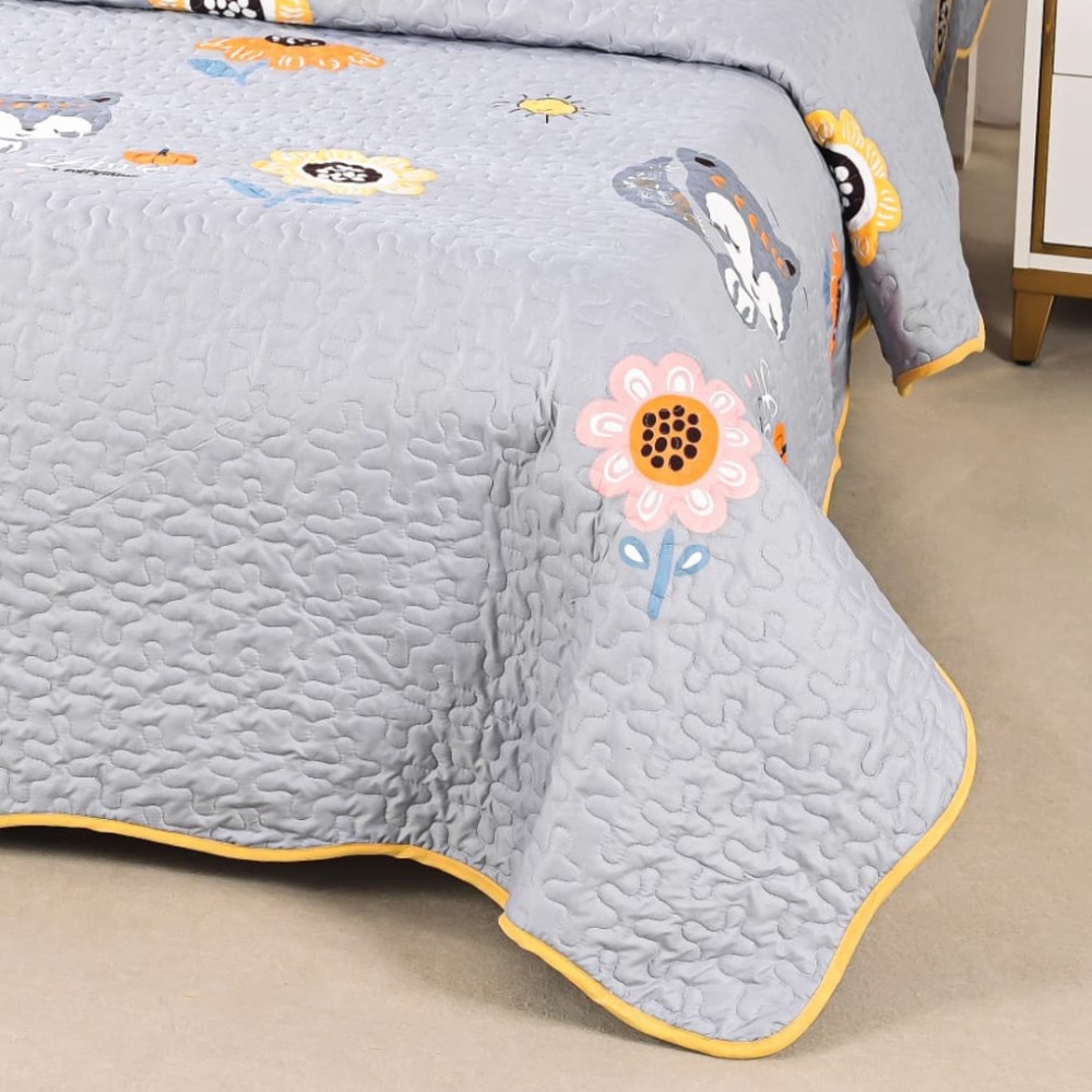 Cuvertură Matlasată din Bumbac Satinat, cu Bordură în Valuri (180x220 cm) + 2 Fețe de Pernă (60x80 cm), Gri, Flori, Casa Minunata, cod produs: INS-CVP04