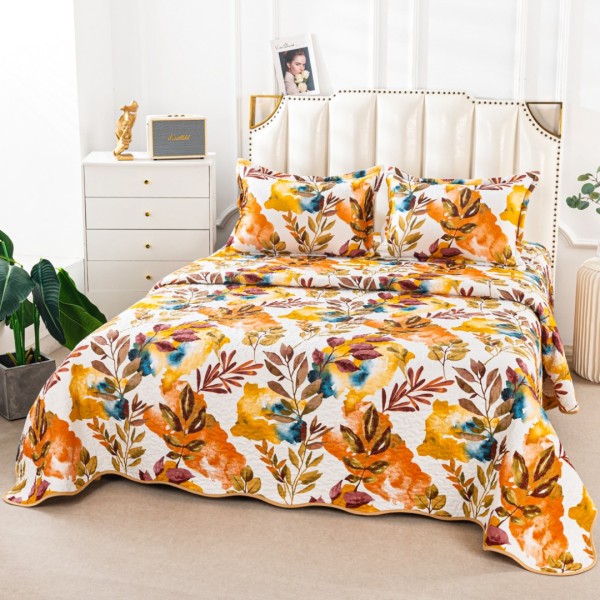 Cuvertură Matlasată din Bumbac Satinat, cu Bordură în Valuri (220x230 cm) + 2 Fețe de Pernă (60x80 cm), Alb, Arămiu, Frunze, Casa Minunata, cod produs: INS-CVS03