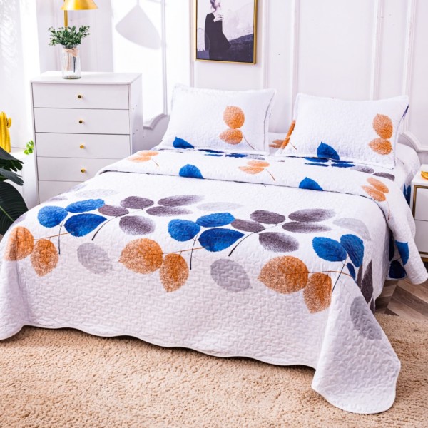 Cuvertură Matlasată din Bumbac Satinat, cu Bordură în Valuri (220x230 cm) + 2 Fețe de Pernă (60x80 cm), Alb, Frunze, Casa Minunata, cod produs: INS-CVS10