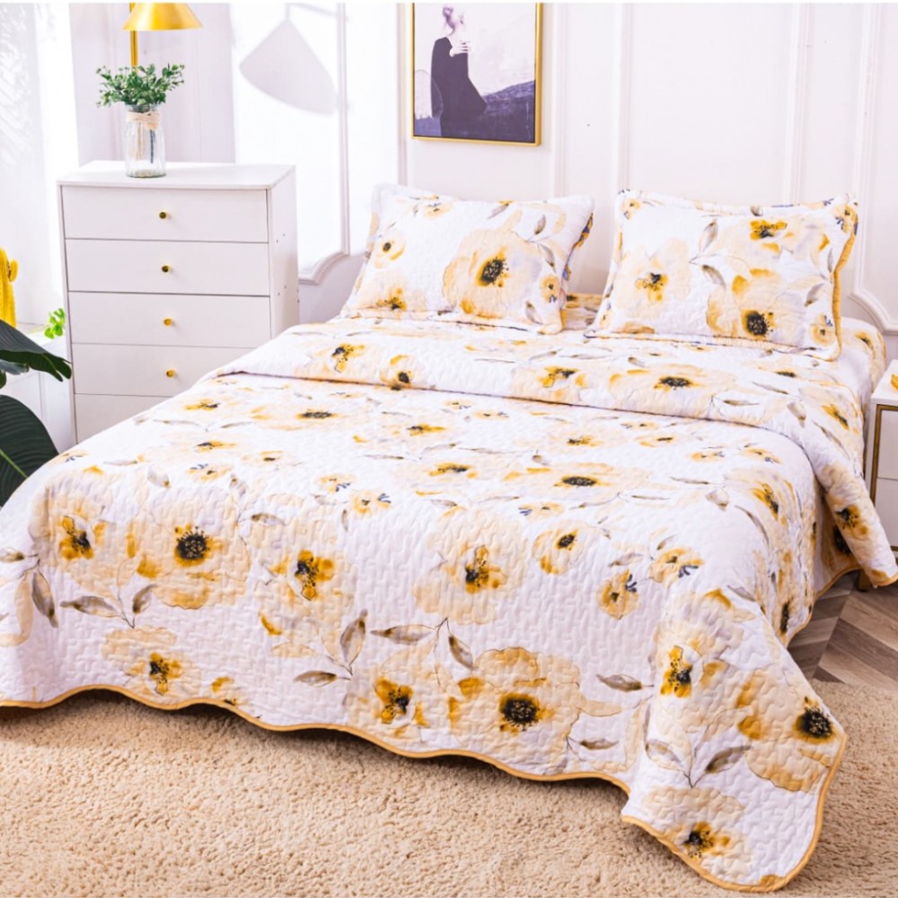 Cuvertură Matlasată din Bumbac Satinat, cu Bordură în Valuri (220x230 cm) + 2 Fețe de Pernă (60x80 cm), Alb, Galben, Flori, Casa Minunata, cod produs: INS-CVS09