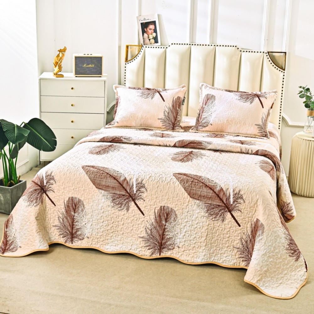 Cuvertură Matlasată din Bumbac Satinat, cu Bordură în Valuri (220x230 cm) + 2 Fețe de Pernă (60x80 cm), Crem, Maro, Pene, Casa Minunata, cod produs: INS-CVS16