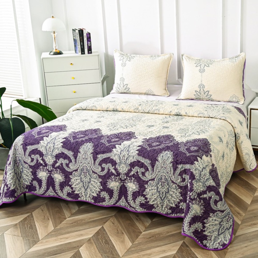 Cuvertură Matlasată din Bumbac Satinat, cu Bordură în Valuri (220x230 cm) + 2 Fețe de Pernă (60x80 cm), Crem, Mov, Model Royal, Casa Minunata, cod produs: INS-CVS06