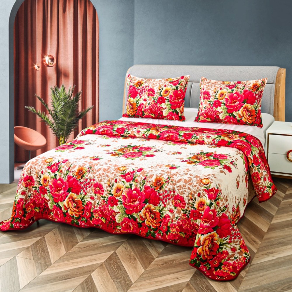 Cuvertură Matlasată din Bumbac Satinat, cu Bordură în Valuri (220x230 cm) + 2 Fețe de Pernă (60x80 cm), Crem, Roșu, Flori, Casa Minunata, cod produs: INS-CVS12